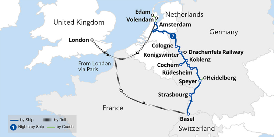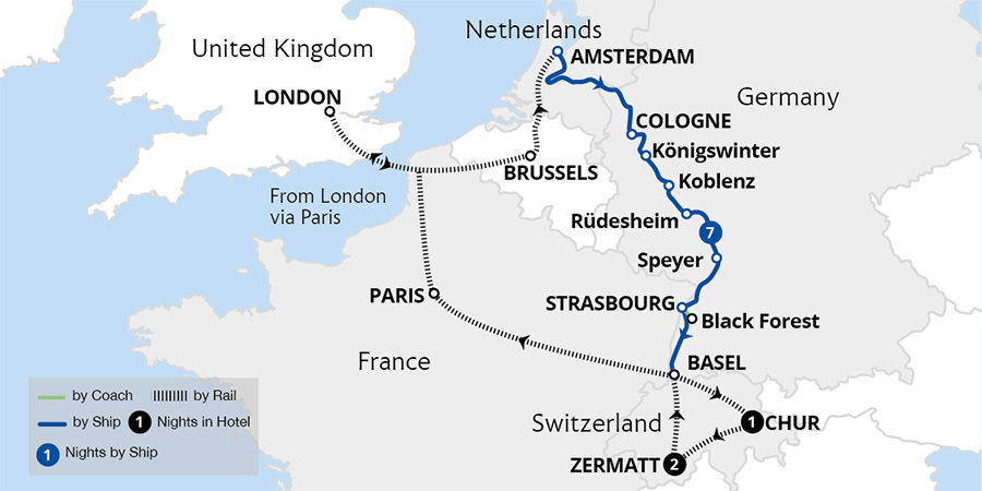 Experience the breathtaking beauty of the Netherlands to Switzerland on a luxury river cruise. Sail through four countries, admiring stunning forested valleys, charming half-timbered towns and historic cities lining the picturesque banks of this incredible river. Marvel at the spectacular scenery of the Rhine Gorge, a UNESCO World Heritage site...