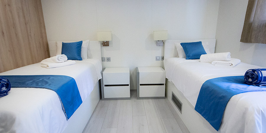 • Cabins feature air-conditioning, a safe, an audio system, a wardrobe, desk, sofa, and a window. En-suite bathrooms include a shower and a hairdryer and beds can be configured to twins or a double.