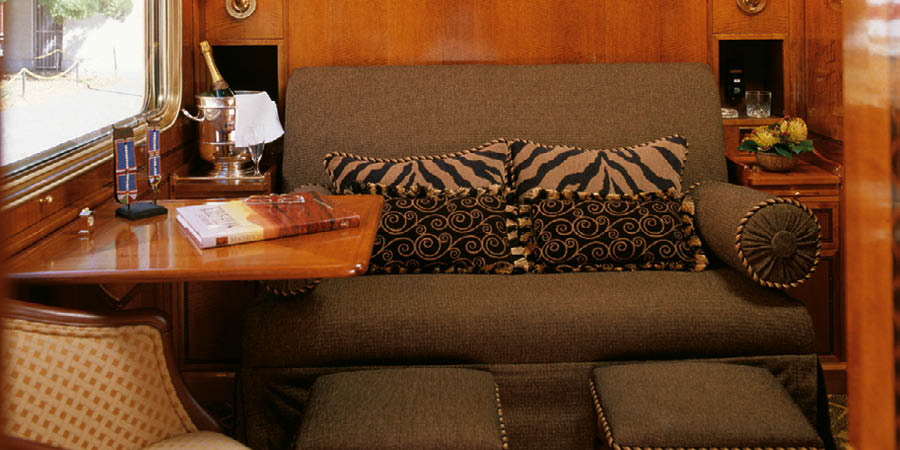 Filled with light and decorated with polished wood paneling and lush fabrics, De Luxe Suites are as cosy as they are luxurious. There are four of these suites in each sleeper carriage, with three featuring two twin-size beds and the fourth with a double bed. Watch South Africa's ebbs and flows unfold while sitting in plush armchairs or on a lounge, and enjoy the convenience of an ensuite bathroom with either a shower or a three-quarter size bathtub. Upscale toiletries, complimentary Wi-Fi, personalised butler service and endless comfort come as standard.