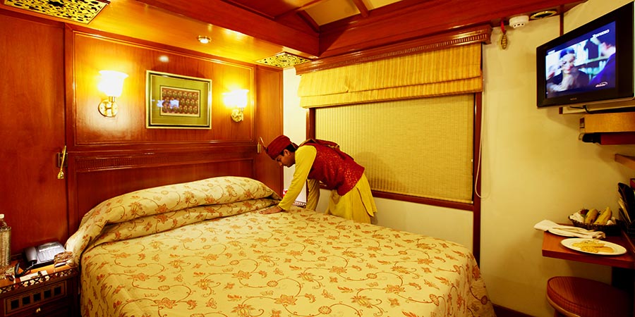 The train's tasteful décor is inspired by the carriages of Indian royalty, with rich tapestries and antiques. Our accommodation is in Deluxe cabins which are beautifully decorated, equipped with every comfort, and feature panoramic windows. These generously-sized cabins are ensuite and feature either a double bed, or twin lower-berth beds. Facilities include air-conditioning, an LCD television, a DVD player, telephone, safe and wardrobe, and free Wi-Fi. Bathrooms are ensuite and equipped with bathrobes, slippers, a hairdryer and complimentary luxury toiletries.